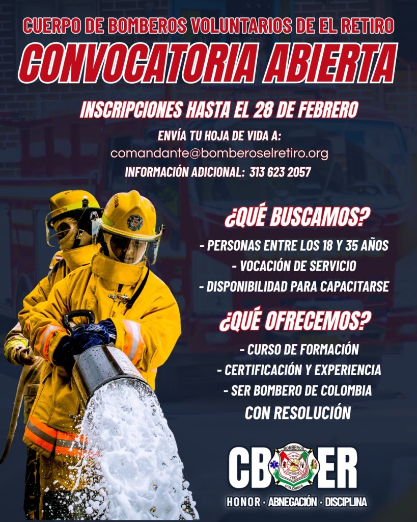 Descubre las oportunidades de empleo disponibles en el Cuerpo de Bomberos Voluntarios El Retiro y únete a nuestro equipo profesional comprometido con la seguridad y el servicio a la comunidad.